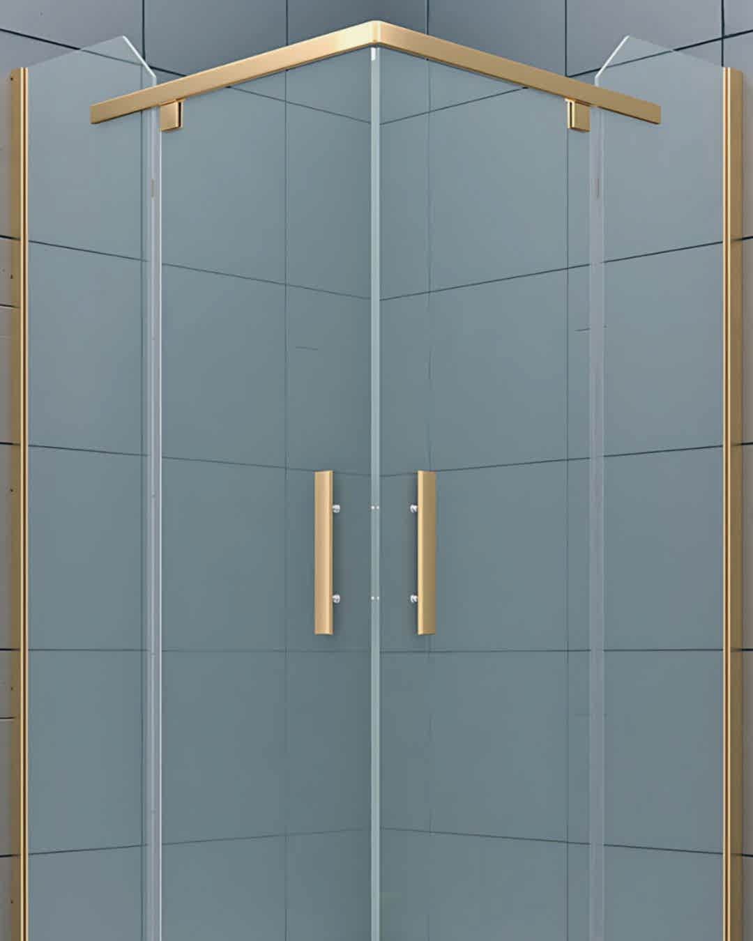 Köşe banyolar için tasarlanan bu kare duş kabini, 2 sabit panel ve nokta menteşeli 2 açılır kapıdan oluşan merkezden açılır bir sisteme sahiptir. Nokta menteşeler, camın zarafetini ön plana çıkaran minimalist bir estetik sunar.