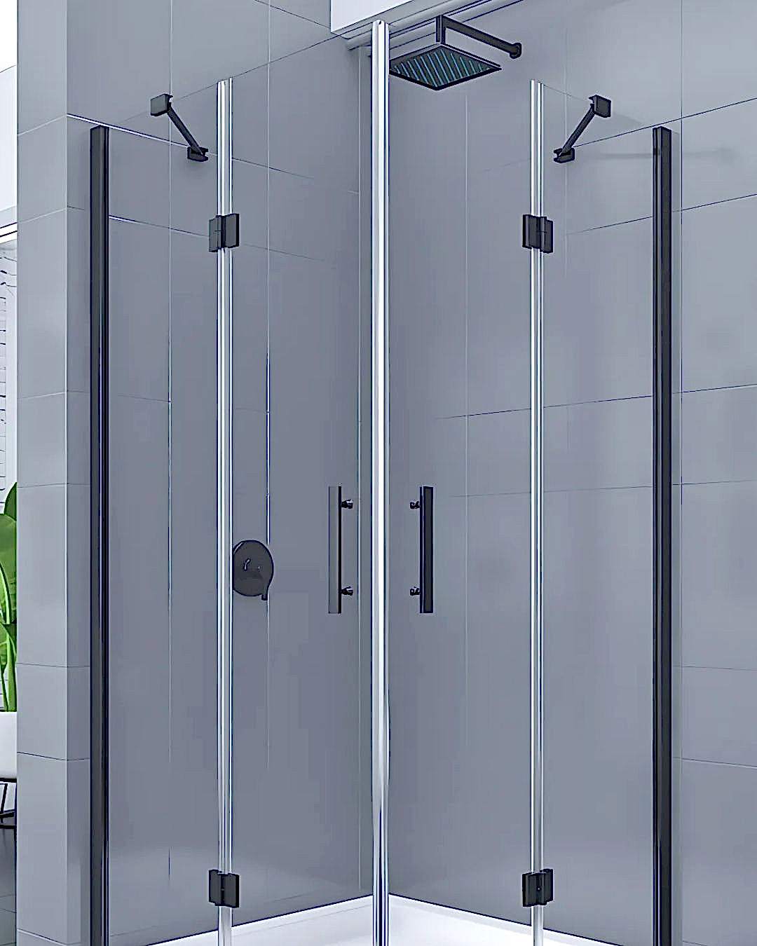 Köşe banyolar için tasarlanan bu kare duş kabini, 2 sabit panel ve nokta menteşeli 2 açılır kapıdan oluşan merkezden açılır bir sisteme sahiptir. Nokta menteşeler, camın zarafetini ön plana çıkaran minimalist bir estetik sunar.