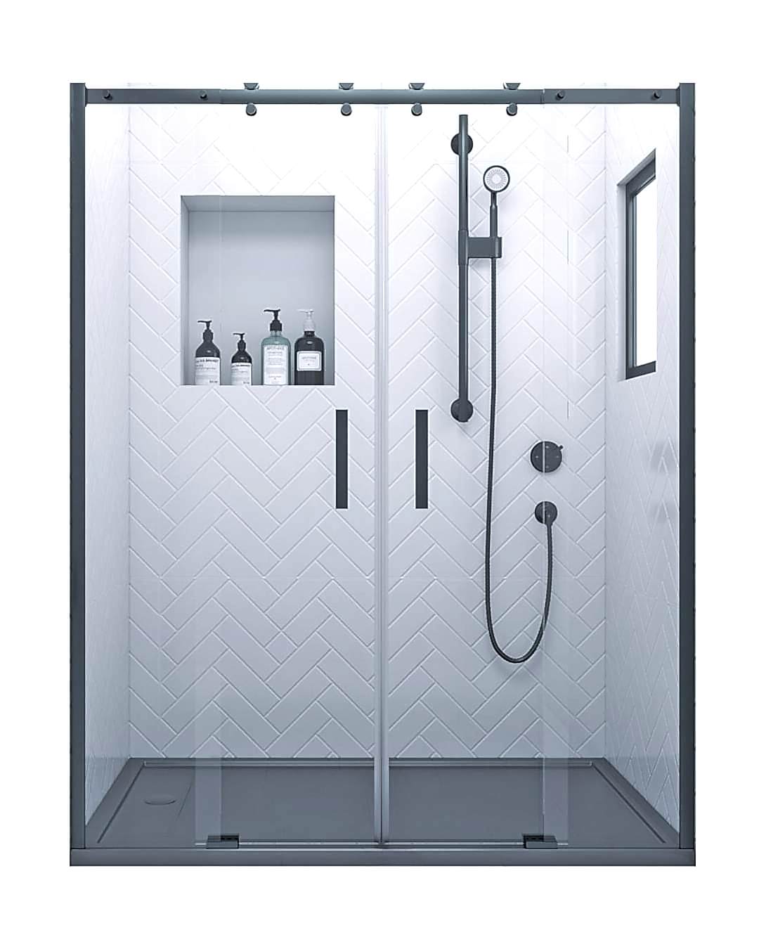 Geniş duş alanları için ideal olan bu model, iki duvar arasına monte edilir ve 2 sabit ve 2 kayar panelden oluşan merkezden açılır sürgülü bir sisteme sahiptir. Geniş girişi sayesinde konforlu bir kullanım sunar.
